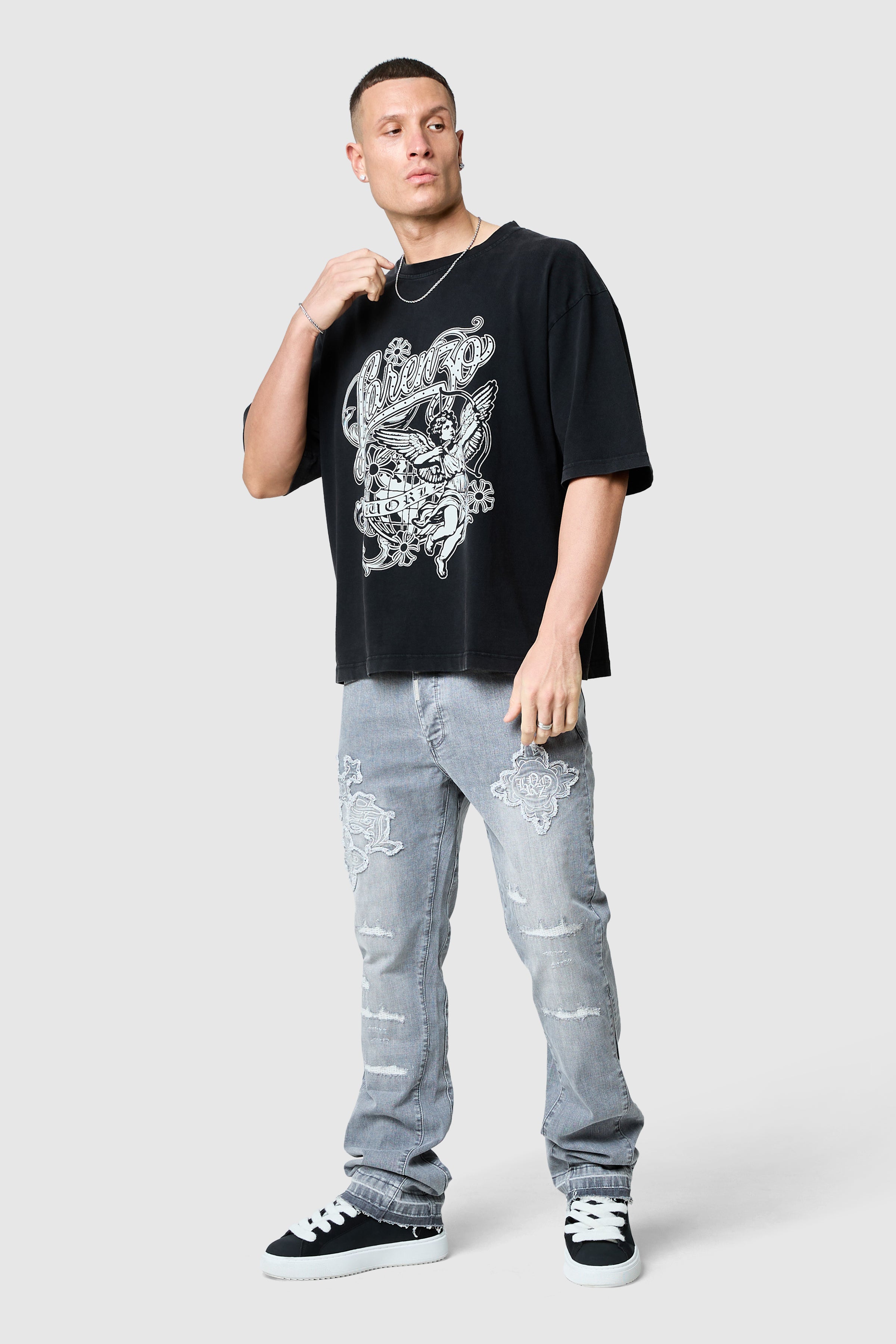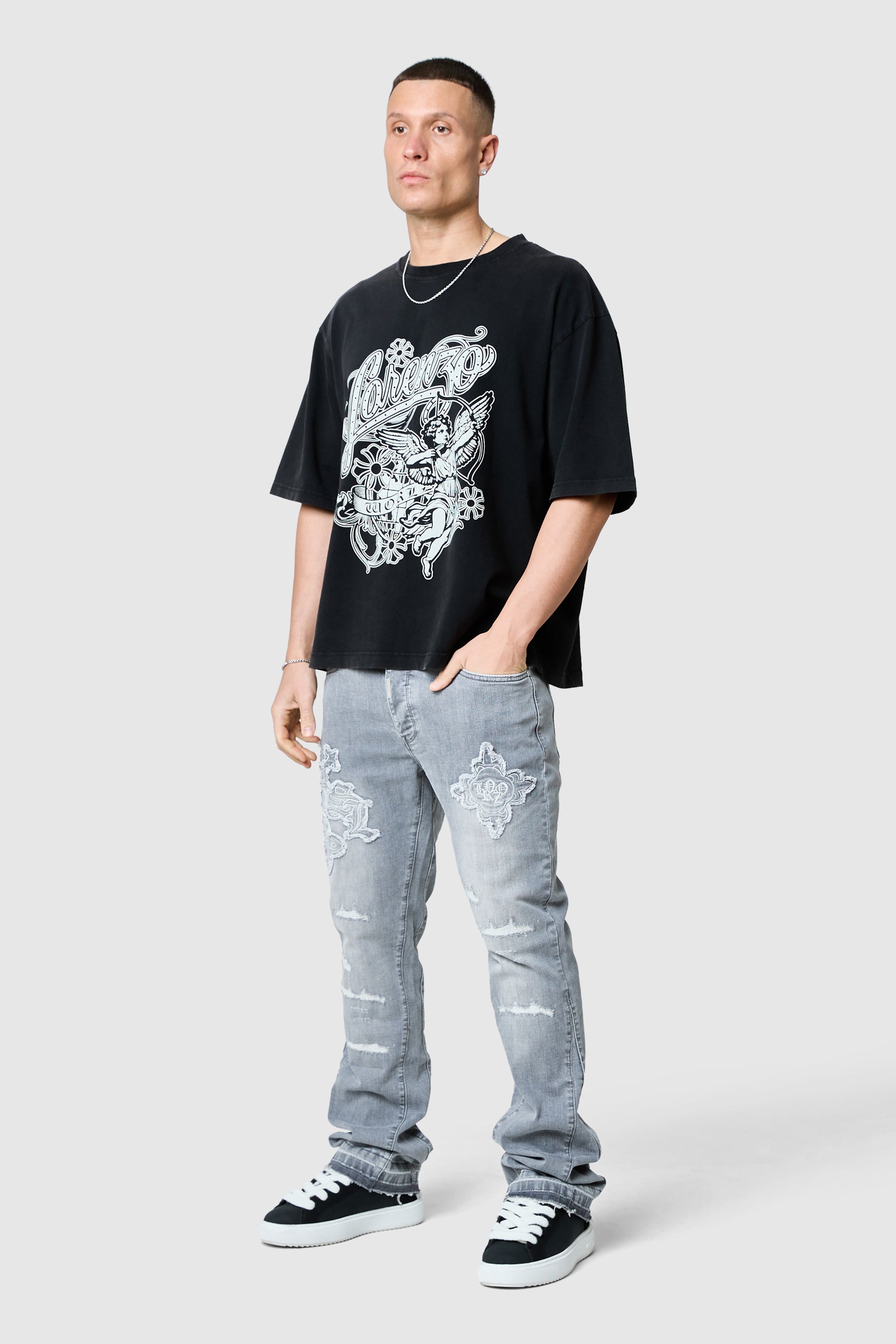 A statement denim designed with bold branded detailing. The Icon Patch in Light Grey Jean features a structured silhouette with raw edge applique cross detailing. Finished with signature metal hardware and an open hem wash, it delivers a modern, elevated take on everyday denim.