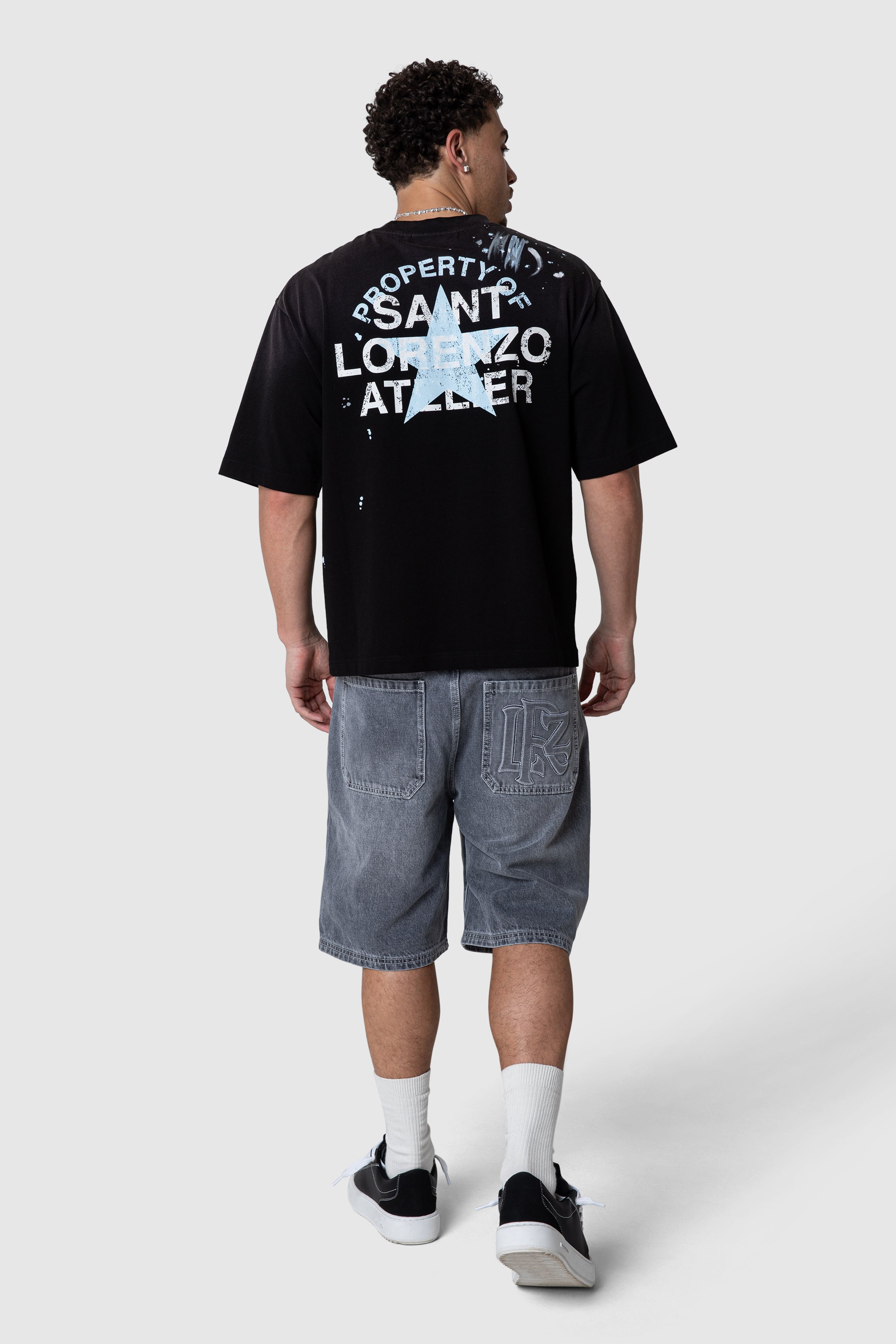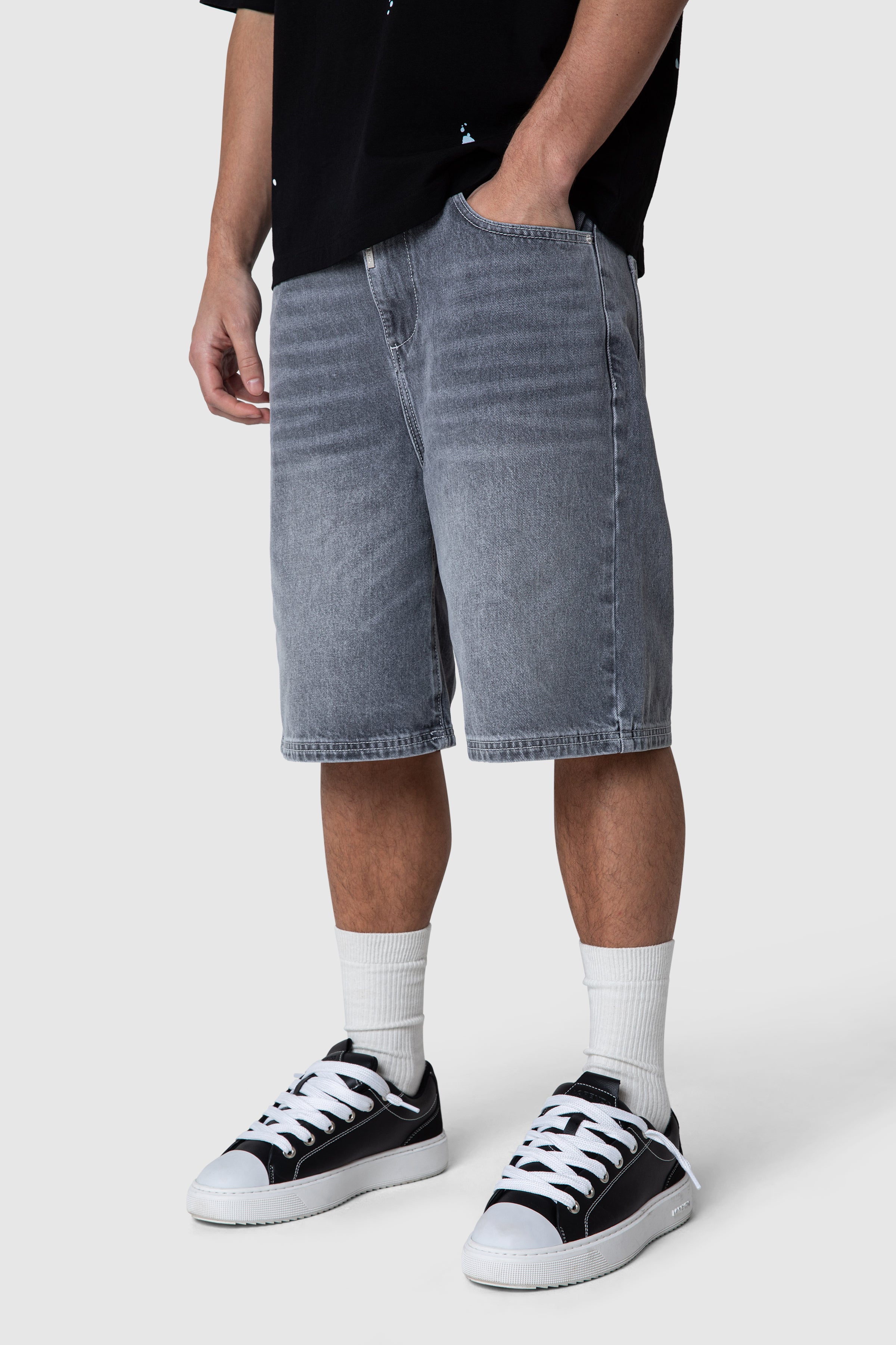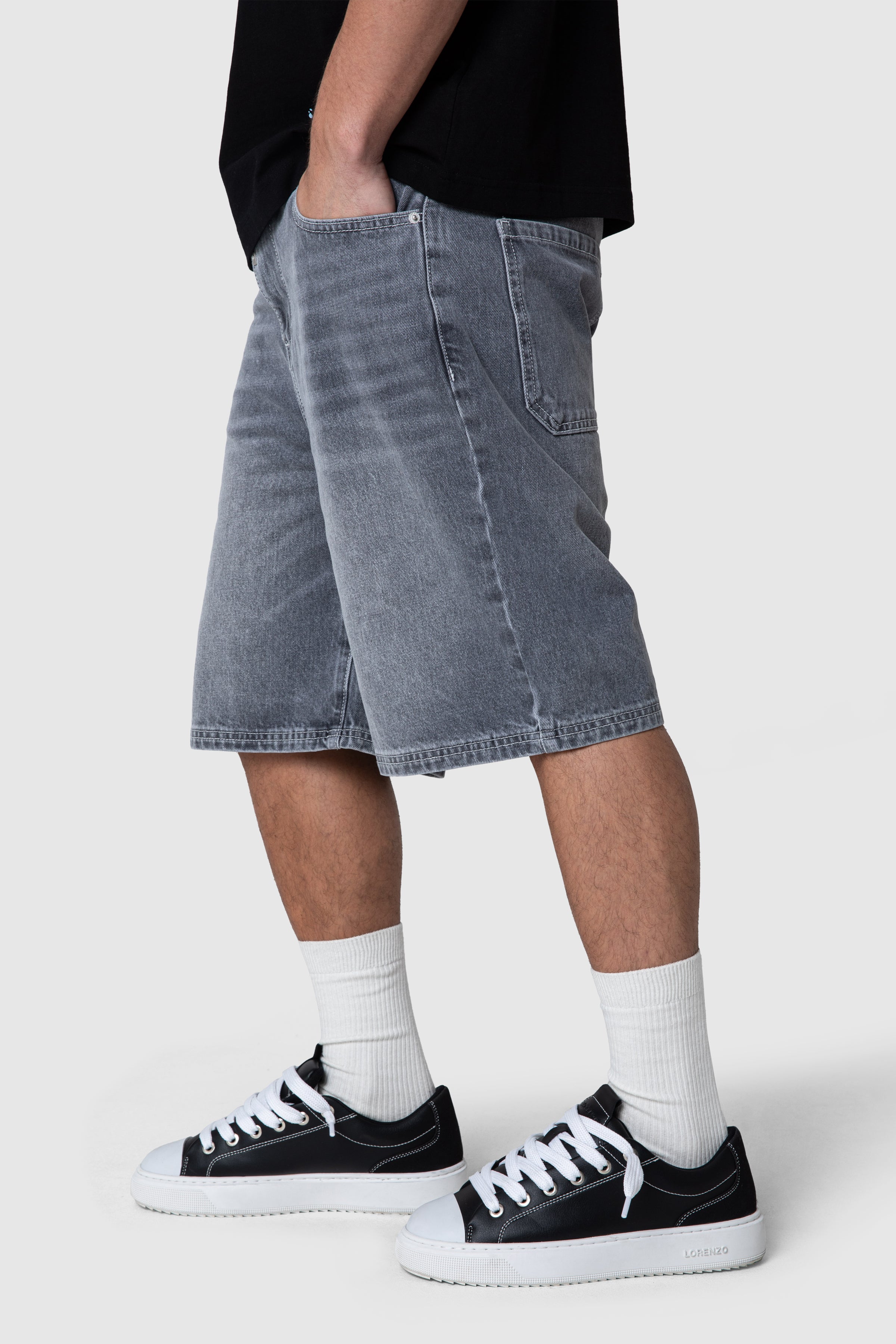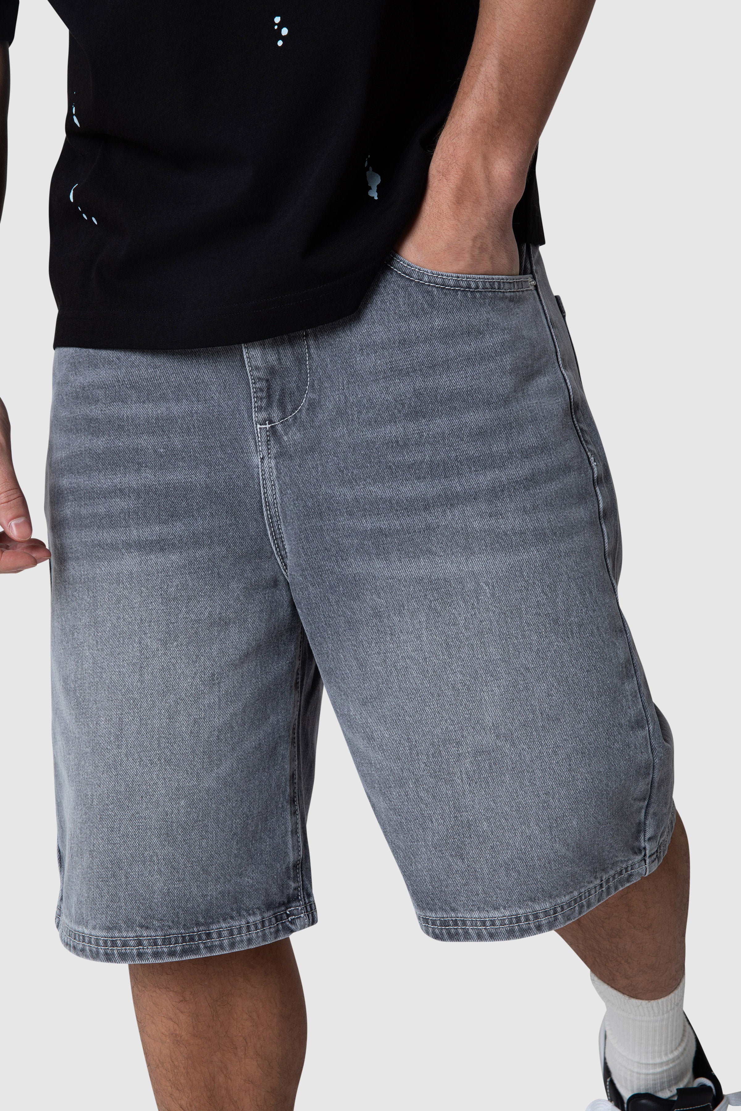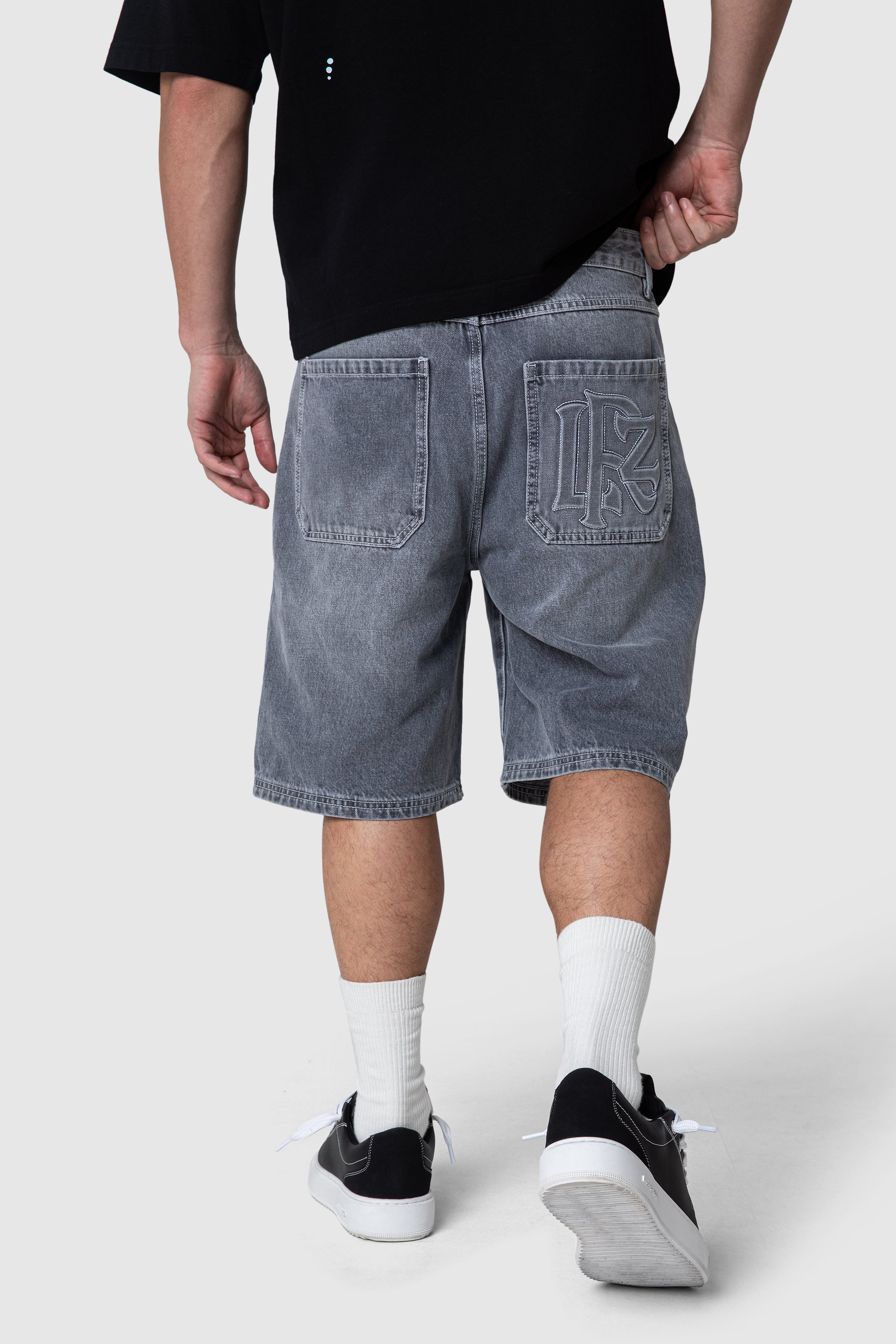A 5-pocket denim jort crafted from 100% cotton for durability and structure. Finished in a granite grey wash, it features brushed silver hardware and subtle branded detailing. Back pocket artwork adds a clean, elevated finish to a classic silhouette.