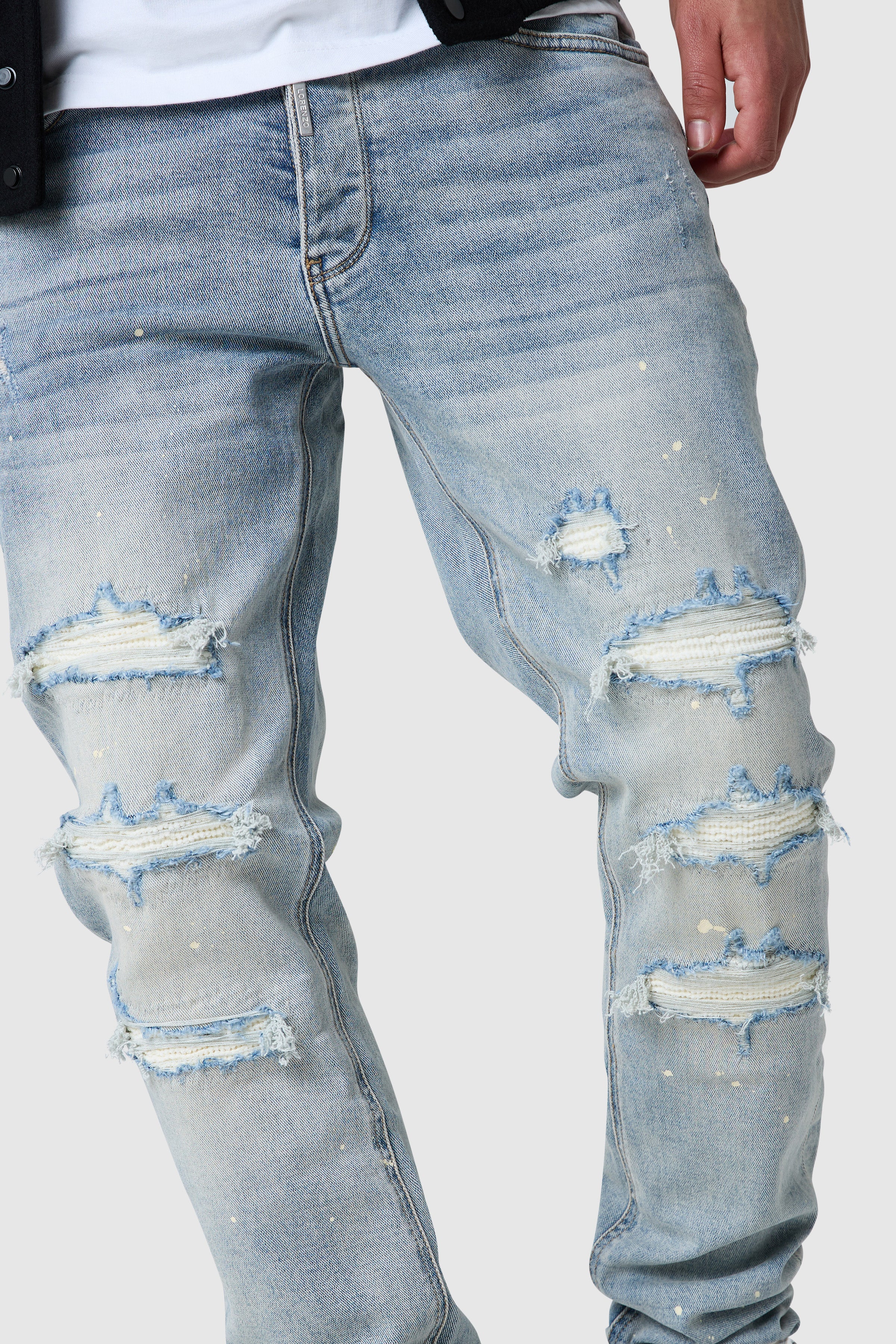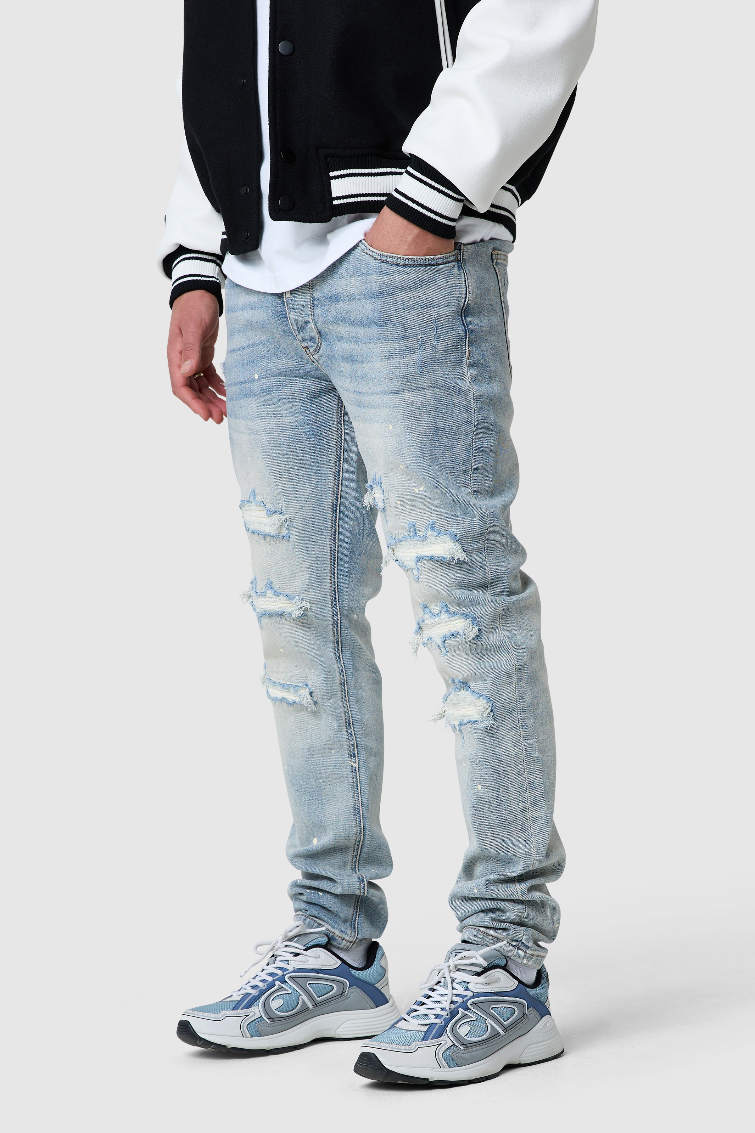 A modern slim denim with worn-in character. The Dillon B Jean in Antique Blue is cut for a streamlined silhouette with natural stacking through the ankle, crafted from a stretch base denim for comfort and everyday movement. Finished with rips and distressing.