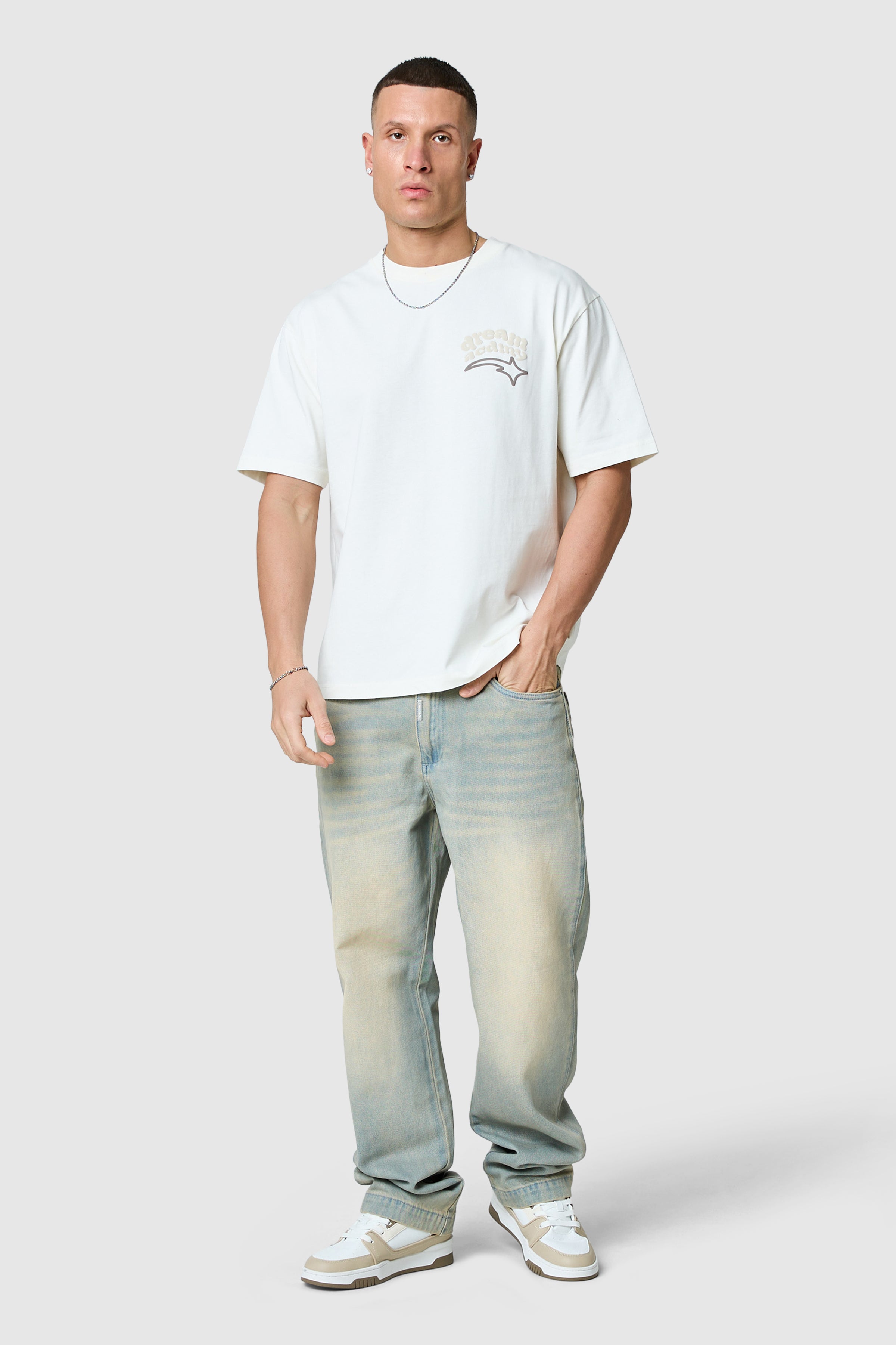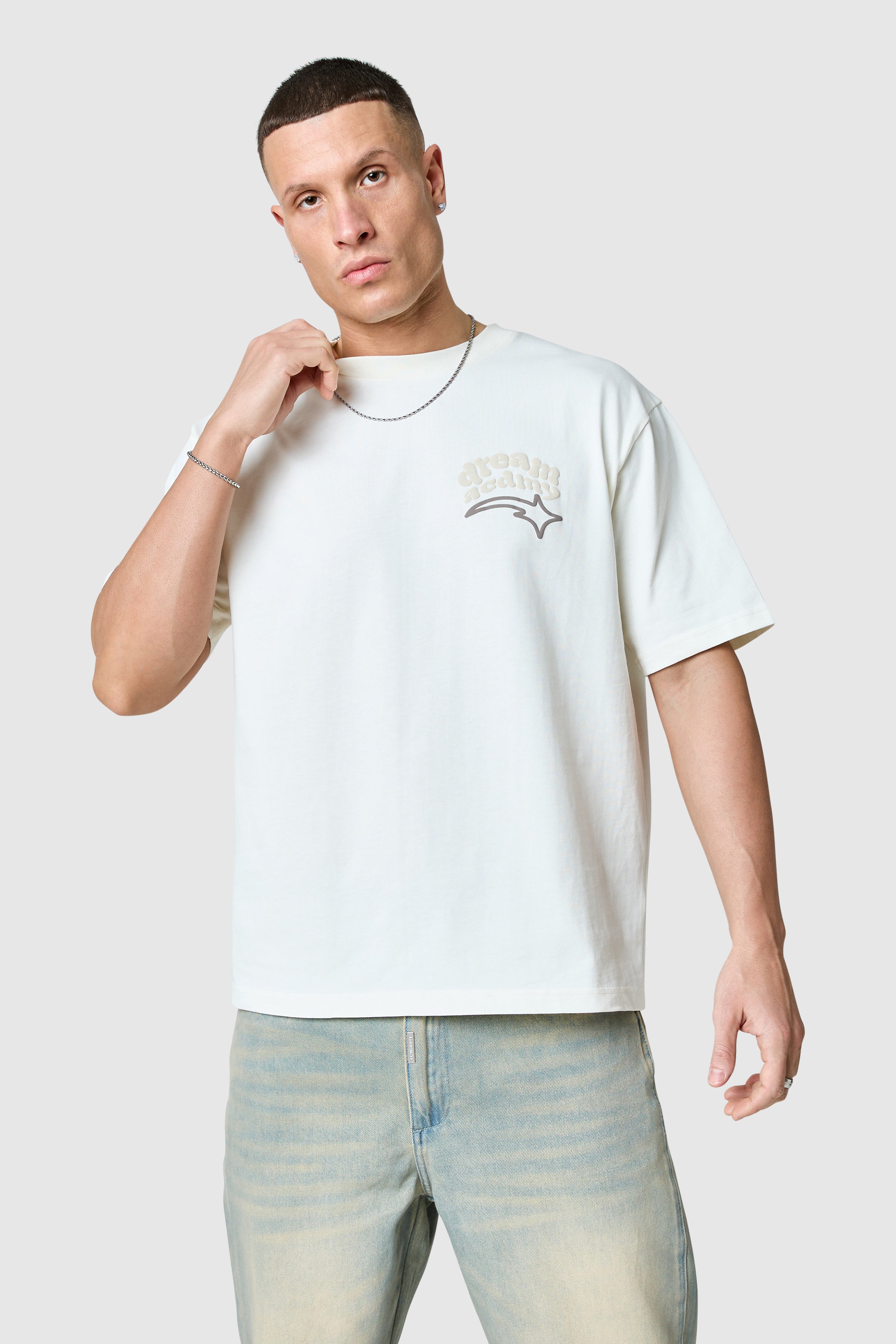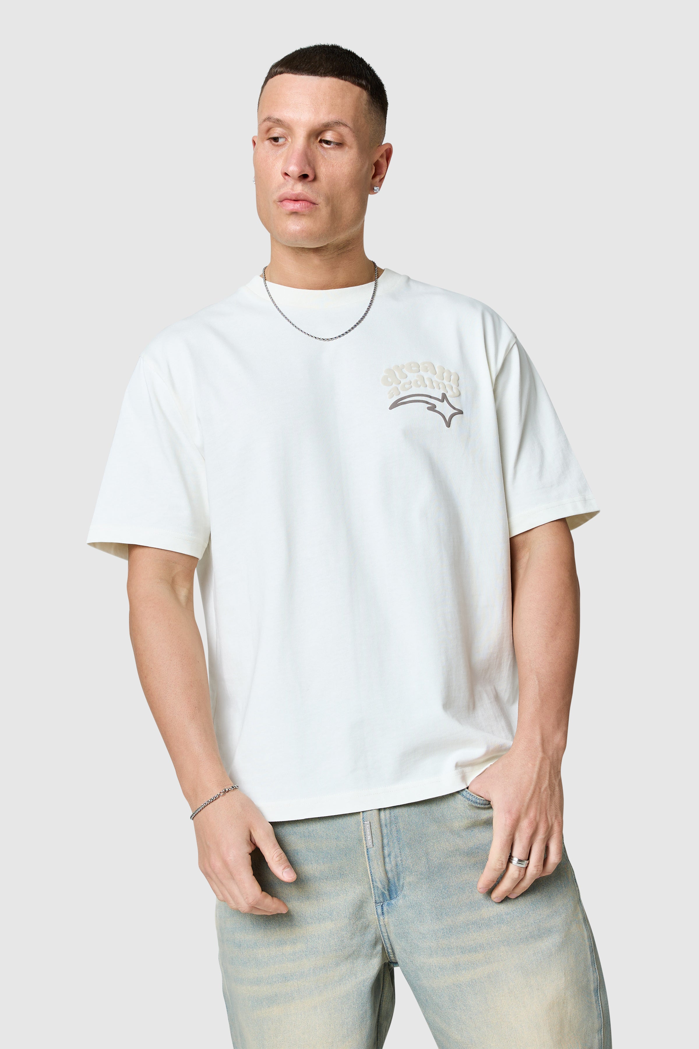 A classic cotton tee with bold, graphic detailing. The Dream Acdmy Tee in Ivory is crafted from 100% cotton jersey (240 GSM)  for a comfortable, structured fit. Finished with tonal back neck tape and label, puff print graphics on the front and back deliver a modern, statement look.