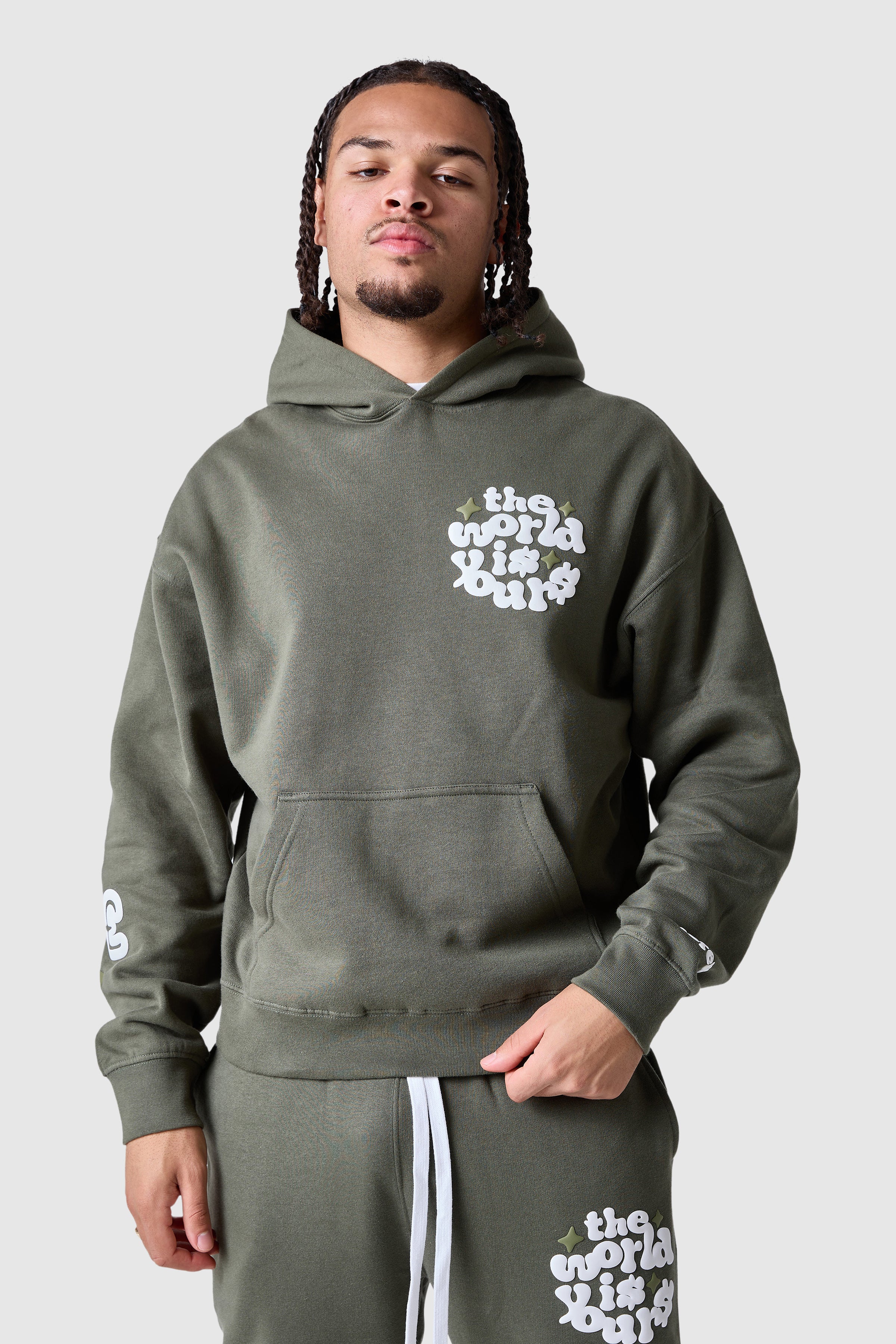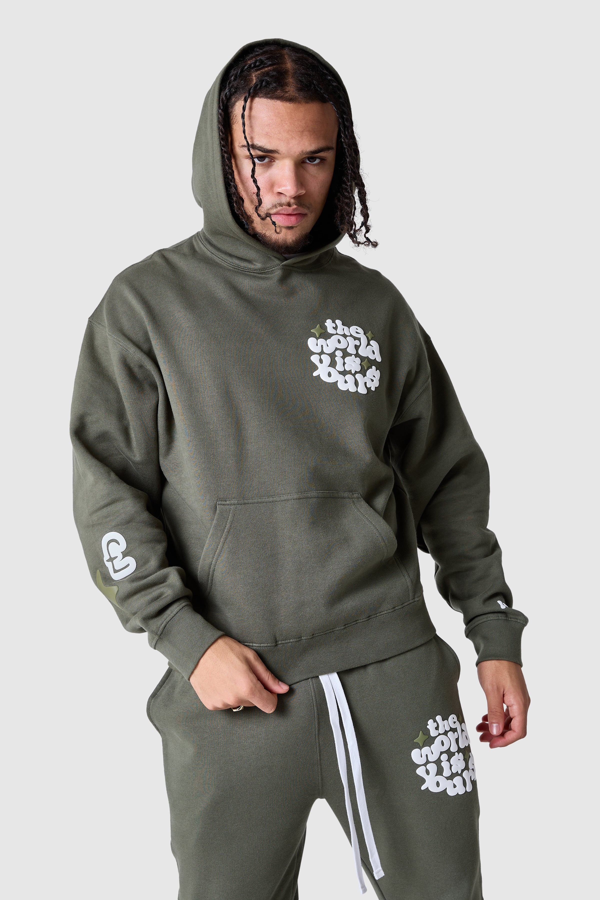 Designed for all-day comfort and bold expression, the World Is Yours Tracksuit features a relaxed hood and flared jogger silhouette. With striking graphic prints and premium fleece construction, this set delivers laid-back confidence with streetwear edge. Style together for a full look or separately to elevate your everyday fits.